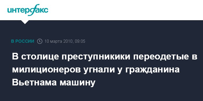 Москва. 10 марта. INTERFAX.RU – Трое неизвестных в милицейской форме похитили среди бела дня в Москве у гражданина Вьетнама автомашину Nissan, сообщил "Интерфаксу" источник в правоохранительных органах города.
