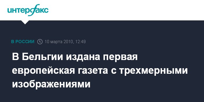 Москва. 10 марта. INTERFAX.RU - Бельгийская франкоязычная ежедневная газета "Дерньер эр", возможно, стала первым трехмерным изданием в Европе, сообщила в среду британская телерадиокорпорация BBC. Каждый выпуск "Дерньер эр" выходит в комплекте со специальными очками, все фотографии и реклама публикуются с трехмерным эффектом, однако текст печатается в обычном формате.