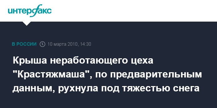 Москва. 10 марта. INTERFAX.RU - Кровля одного из цехов Красноярского завода тяжелого машиностроения ("Крастяжмаш") площадью около 2 тыс. кв. метров обрушилась под тяжестью снега. Как сообщили агентству "Интерфакс-Сибирь" в пресс-службе ГУ МЧС по Красноярскому краю, пострадавших нет, поскольку расположенный на окраине Красноярска цех являлся не действующим. "Причины обрушения предстоит установить, но, по предварительной оценке, кровля обрушилась под весом снежной массы", - пояснили в пресс-службе.