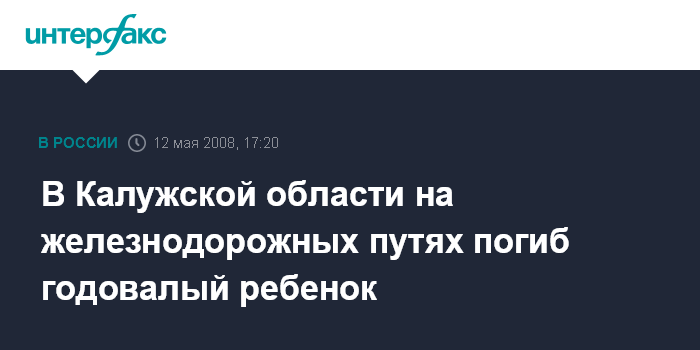 Калуга. 12 мая. INTERFAX.RU - В Калужской области на железнодорожном перегоне Калуга II - Воротынск в минувшее воскресенье вечером погиб годовалый ребенок, сообщила "Интерфаксу" в понедельник начальник по делам несовершеннолетних линейного отдела внутренних дел станции "Калуга" Елена Коренкова. По ее словам, наезд на малыша на 187 километре совершил пассажирский поезд N34 сообщением Одесса-Москва.