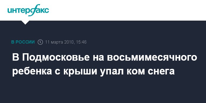 Москва. 11 марта. INTERFAX.RU - В подмосковной Коломне в четверг большой ком снега упал с крыши на коляску, в которой находился восьмимесячный младенец, ребенок госпитализирован, сообщили "Интерфаксу" в управлении информации и общественных связей ГУВД региона.