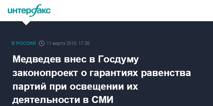 Москва. 11 марта. INTERFAX.RU - Президент России Дмитрий Медведев внес в Государственную Думу проект федерального закона "О внесении изменений в статью 32 Федерального закона "О политических партиях", сообщила в четверг пресс-служба главы государства. Законопроектом определяются основные положения по обеспечению гарантий равенства политических партий, представленных в парламентах субъектов РФ, при освещении их деятельности региональными телеканалами и радиоканалами.