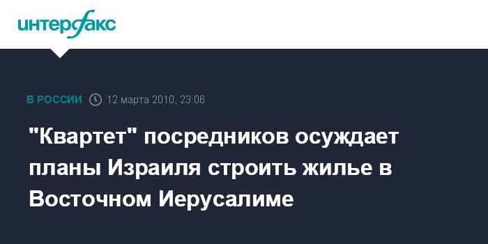 "Квартет" осуждает решение Израиля продвигать планы по возведению нового жилья в Восточном Иерусалиме. Участники "квартета" условились внимательно отслеживать положение дел в Иерусалиме и держать в поле зрения дополнительные шаги, которые могут потребоваться для реагирования на ситуацию на местах", - говорится в заявлении "квартета", опубликованном на сайте МИД РФ.