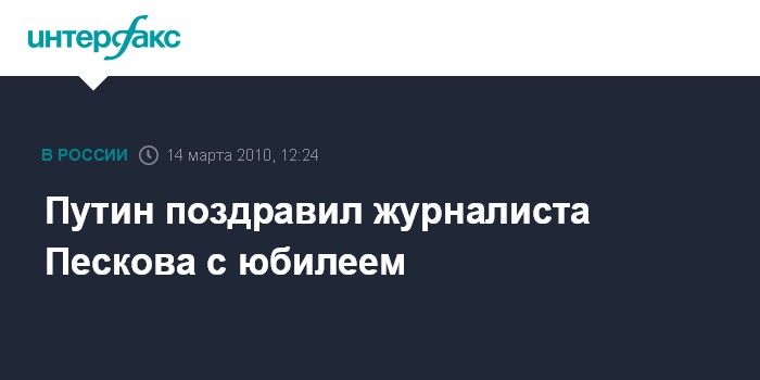 Москва. 14 марта. INTERFAX.RU - Председатель правительства России Владимир Путин направил поздравление обозревателю газеты "Комсомольская правда" Василию Пескову по случаю 80-летнего юбилея. "Талант писателя, журналиста и публициста, неиссякаемая творческая энергия позволили Вам добиться успеха на профессиональном поприще, завоевать признание огромной читательской аудитории", - говорится, в частности, в поздравлении российского премьера.