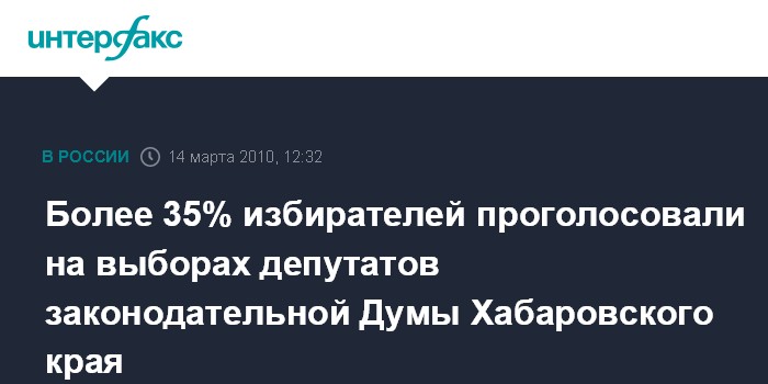 Москва/Хабаровск. 14 марта. INTERFAX.RU - Более трети избирателей по состоянию на 12:00 мск приняли участие в голосовании на выборах депутатов законодательной Думы Хабаровского края, сообщил председатель краевого избиркома Виктор Цырфа. "По состоянию на 19:00 (12:00 мск), явка избирателей составила 35,48%", - сказал В.Цырфа в воскресенье, выступая на связи с Центризбиркомом РФ в режиме видеоконференции.