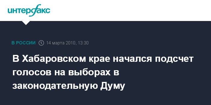 Хабаровск. 14 марта. INTERFAX.RU - На выборах депутатов законодательной Думы Хабаровского края в 20:00 по местному времени (13:00 мск) закрылись избирательные участки, начался подсчет голосов, сообщил агентству "Интерфакс - Дальний Восток" сотрудник краевой избирательной комиссии. "По сравнению с предыдущими выборами депутатов краевой думы - в 2005 году явка избирателей стала выше более чем на один процент", - отметил собеседник агентства. Вместе с тем, согласно информации председателя краевого избиркома Виктора Цырфы, к 19:00 по местному времени (12:00 мск) явка избирателей составила 35,48%.