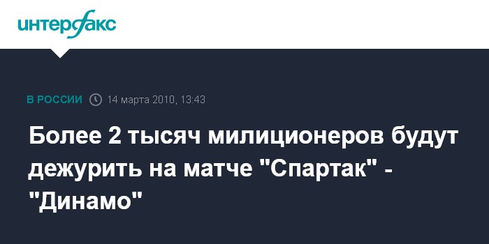 Москва. 14 марта. INTERFAX.RU - Безопасность во время футбольного матча между командами "Спартак" - "Динамо", на стадионе "Лужники" в Москве будут обеспечивать 2 тыс. 200 сотрудников правоохранительных органов, сообщил "Интерфаксу" дежурный офицер группы оперативно-информационного реагирования ГУВД Москвы. Как отметил собеседник агентства, ожидается, что стадион в воскресенье вечером посетят около 50 тыс. болельщиков.