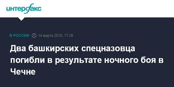 Уфа. 14 марта. INTERFAX.RU - В Чечне при проведении спецоперации погибли двое военнослужащих Уфимского отряда специального назначения внутренних войск МВД России. Как сообщили в воскресенье агентству "Интерфакс-Поволжье" в правоохранительных органах Башкирии, прапорщик и ефрейтор (один - уроженец Башкирии, другой - Самары), проходящие службу в отряде спецназа по контракту, в воскресенье ночью участвовали в спецмероприятиях в районе Бамута, где накануне произошло несколько боестолкновений с незаконными вооруженными формированиями.