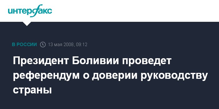 Лима. 13 мая. INTERFAX.RU - В Боливии 10 августа состоится референдум, на который будет вынесен вопрос о доверии президенту страны Эво Моралесу, вице-президенту Альваро Гарсиа Линере и главам департаментов. Соответствующее постановление было подписано главой боливийского государства, сообщает государственная радиостанция Radio Patria Nueva.