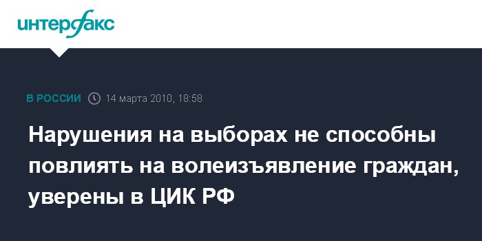 Москва. 14 марта. INTERFAX.RU - Первый заместитель председателя ЦИК РФ Леонид Ивлев отмечает, что нарушения, которые происходят на региональных и местных выборах в Единый день голосования 14 марта, не являются массовыми и серьезными. "Больших нарушений нет, и эти нарушения не способны повлиять на волеизъявление граждан. Они не носят массовый характер", - сказал Л.Ивлев в воскресенье журналистам. Исходя из этого, он делает вывод, что "мы получим достоверные данные о волеизъявлении граждан".