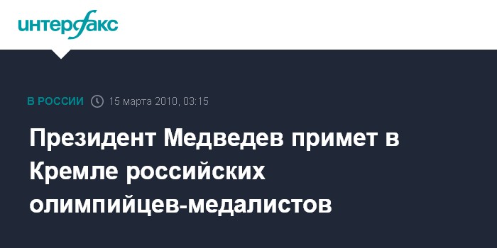 Москва. 15 марта. ИНТЕРФАКС - Президент РФ Дмитрий Медведев встретится в понедельник в Кремле с российскими спортсменами - призерами Зимней Олимпиады в Ванкувере.