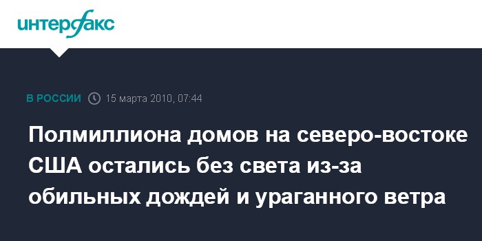 Нью-Йорк. 15 марта. ИНТЕРФАКС - 500 тыс. домов остались без света в северо-восточных и Средне-Атлантических штатах США в результате сильнейших дождей, которые продолжаются там вторые сутки подряд, сообщает американская телекомпания Си-эн-эн.