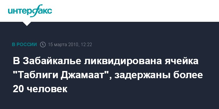 Москва. 15 марта. INTERFAX.RU - Сотрудники УФСБ России по Забайкальскому краю, УВД и прокуратуры пресекли в Чите деятельность членов запрещенной на территории России международной религиозной (исламской) экстремистской организации "Таблиги Джамаат", сообщает пресс-службу УФСБ Забайкальского края. "Взят с поличным при проведении религиозного собрания лидер ячейки. Задержаны более 20 последователей движения "Таблиги Джамаат", среди которых есть иностранцы, пребывающие на территории нашей страны с нарушением миграционного законодательства Российской Федерации", - говорится в сообщении.
