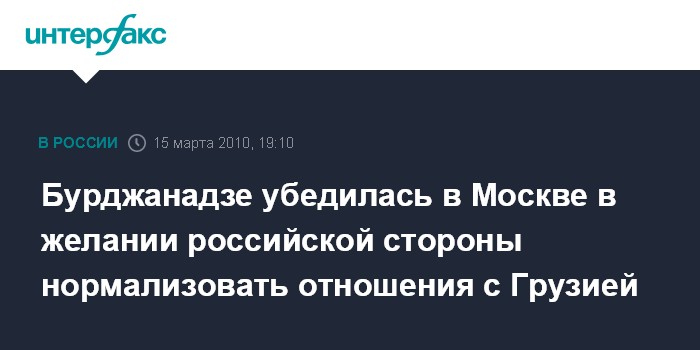 Тбилиси. 15 марта. INTERFAX.RU - Лидер партии "Демократическое движение - единая Грузии" Нино Бурджанадзе по итогам своей поездки в Москву сделала вывод, что российское руководство считает возможной нормализацию отношений с Грузией путем переговоров по всем имеющимся в этой области проблемам.