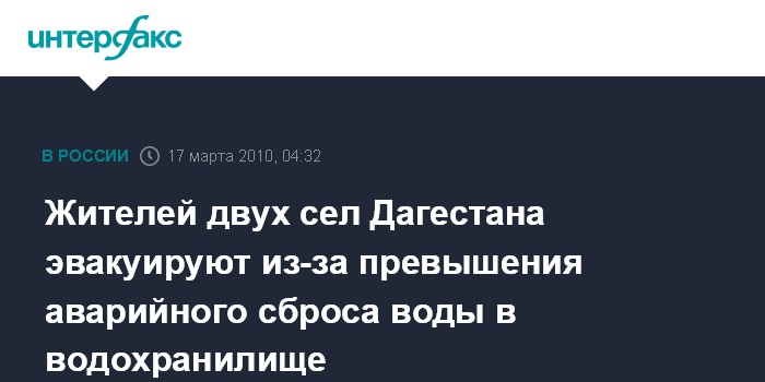 Ростов-на-Дону. 17 марта. ИНТЕРФАКС-ЮГ - Из-за превышения уровня аварийного сброса воды в Деджухском водохранилище ведется эвакуация жителей двух населенных пунктов в Дербентском районе Дагестана.