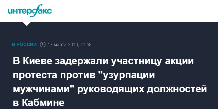 Москва. 17 марта. INTERFAX.RU - Правоохранители задержали в Киеве у здания правительства одну из активисток женского движения "FEMEN", которая принимала участие в акции протеста у стен Кабинета министров. Как передает корреспондент агентства "Интерфакс-Украина", движение "FEMEN" в среду проводит акцию против "узурпации мужчинами всех руководящих должностей в Кабинете министров Украины". "Украина - единственная страна в мире, где во главе всех министерств стоят мужчины", - заявила одна из участниц акции.