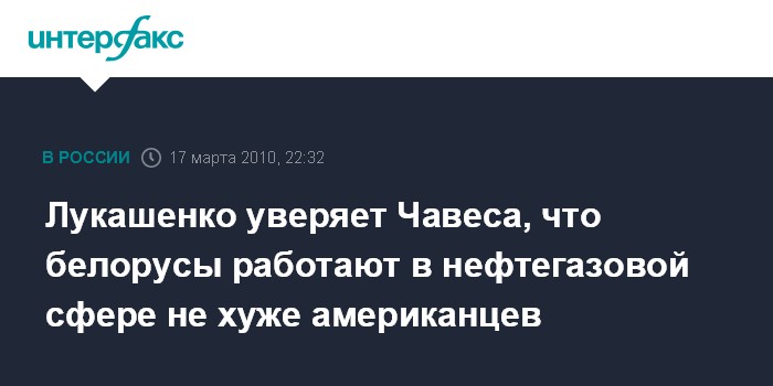 Каракас. 17 марта. ИНТЕРФАКС-ЗАПАД - Президент Белоруссии Александр Лукашенко заверил президента Венесуэлы Уго Чавеса, что белорусские специалисты могут работать в сфере нефте- и газодобычи не хуже представителей американских компаний.