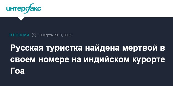 Дели. 18 марта. ИНТЕРФАКС - Русская туристка по имени Елена в ночь на четверг обнаружена мертвой в своем номере в отеле в Северном Гоа, в районе курорта Арапора.