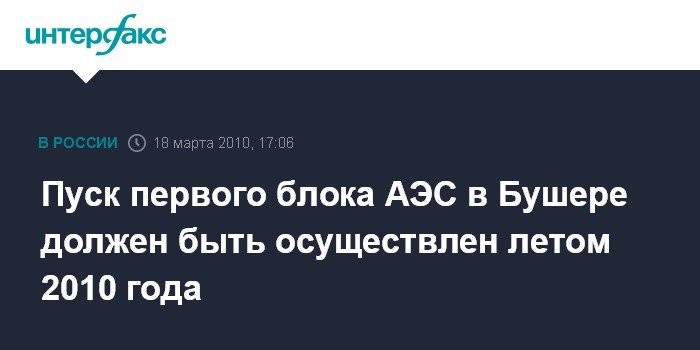 Пуск первого блока АЭС в Бушере должен быть осуществлен летом 2010 года