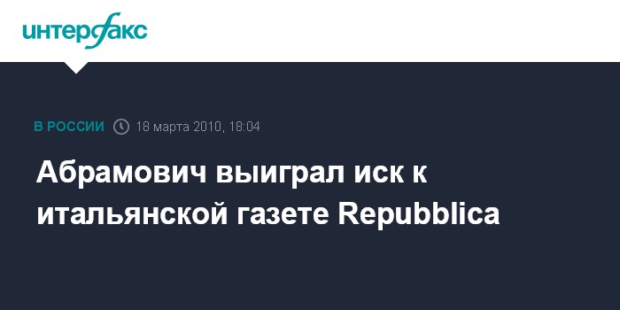 Лондон. 18 марта. INTERFAX.RU - Крупный российский предприниматель Роман Абрамович выиграл в лондонском суде дело о клевете против итальянской газеты Repubblica, сообщила в четверг BBC.
