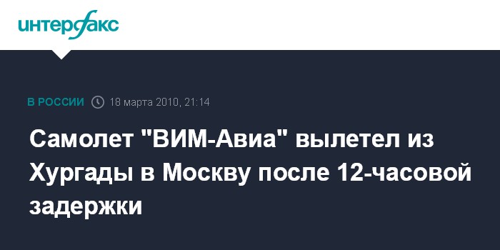 Москва. 18 марта. INTERFAX.RU - Самолет авиакомпании "ВИМ-Авиа вылетел из Хургады в Москву в 20:00 мск после почти 12-часовой задержки, сообщил "Интерфаксу" представитель компании.