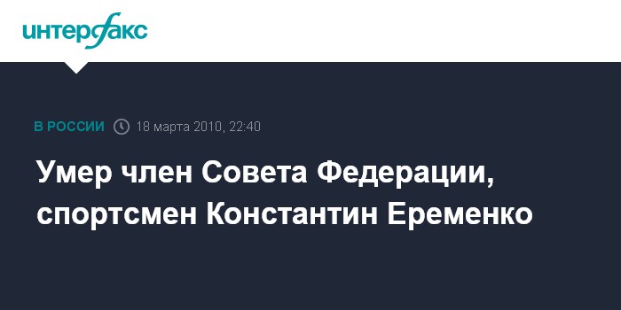 Москва. 18 марта. ИНТЕРФАКС-МОСКВА - Известный российский спортсмен, член Совета Федерации от Воронежской области Константин Еременко скончался на 40-м году жизни, сообщили "Интерфаксу" источники в медицинских кругах столицы.