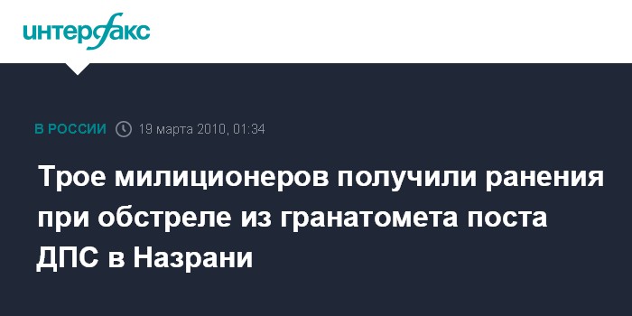 Назрань. 19 марта. ИНТЕРФАКС-ЮГ - В Назрани на федеральной трассе "Кавказ" неизвестные из автоматического оружия и гранатометов обстреляли пост ДПС, ранены трое сотрудников милиции.