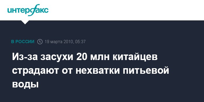 Пекин. 19 марта. ИНТЕРФАКС - Более 20 млн человек на юго-западе Китая страдают от острого дефицита питьевой воды, сообщает центральное телевидение Китая.