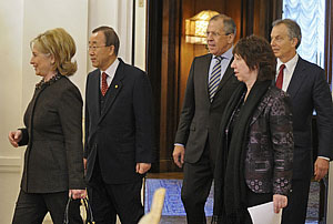 Москва. 19 марта. INTERFAX.RU - Глава МИД РФ Сергей Лавров, госсекретарь США Хиллари Клинтон, генсек ООН Пан Ги Мун, верховный представитель ЕС по внешней политике и политике безопасности Кэтрин Эштон и спецпредставитель "квартета" посредников Тони Блэр обсуждали в Москве варианты урегулирования очередного обострения ситуации в Палестине.