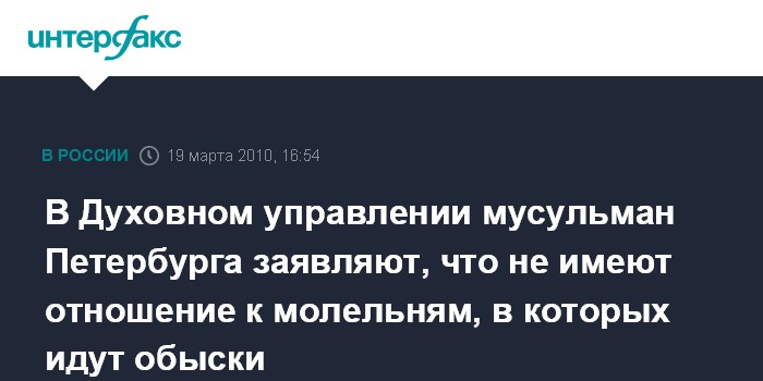 Москва. 19 марта. INTERFAX.RU - В Духовном управлении мусульман Петербурга и Северо-Запада заявляют, что в подведомственных им религиозных учреждениях обыски не проводятся. "Ни в одной нашей молельне обысков нет", - заявил "Интерфаксу" в пятницу представитель управления. Он предположил, что обыски, о которых сообщил СКП, проходят в религиозных организациях, учрежденных приехавшими недавно в Петербург мигрантами и не входящих в подчинение управления. "Все эти организации открыто нарушают закон, и мы к ним никакого отношения не имеем, к этим организациям, которые наплодились за последний период времени", - подчеркнул собеседник агентства.