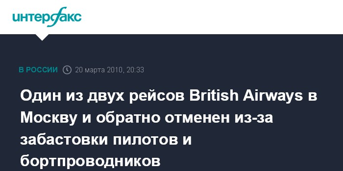 Москва. 20 марта. ИНТЕРФАКС - Авиакомпания British Airways отменила один из двух регулярных рейсов по маршруту Лондон - Москва на весь период забастовки пилотов и бортпроводников, сообщает в субботу телеканал "Россия-24".
