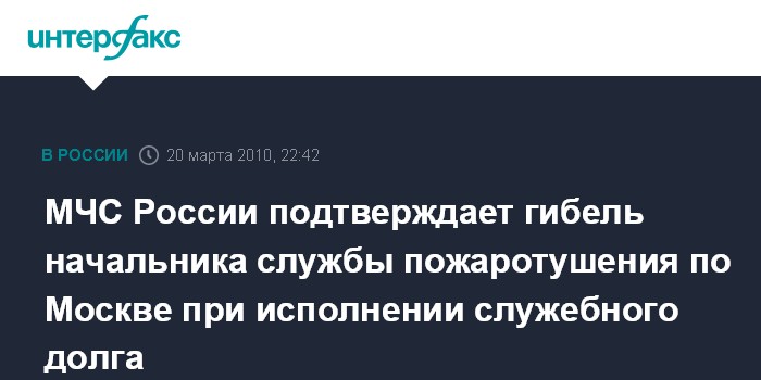 Москва. 20 марта. ИНТЕРФАКС-МОСКВА - МЧС РФ подтверждает гибель на пожаре начальника службы пожаротушения ГУ МЧС по Москве полковника Евгения Чернышева.
