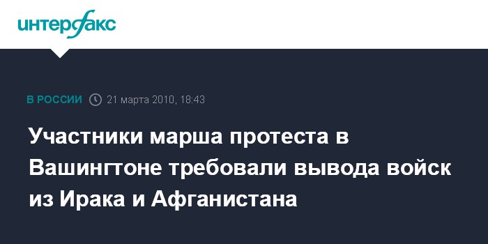 Вашингтон. 21 марта. INTERFAX.RU - Антивоенный марш протеста прошел в субботу в Вашингтоне. По данным организаторов, в шествии приняли участие 10 тысяч человек, по данным полиции - 2,5 тысячи. Участники акции потребовали немедленного прекращения военных операций в Ираке и Афганистане и перераспределения военных расходов на здравоохранение и увеличение рабочих мест в США. Демонстранты скандировали лозунги: "Деньги на работу и образование, а не на войну и оккупацию!" и "Вывести войска сейчас!"