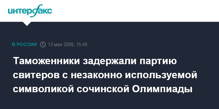 Москва. 13 мая. INTERFAX.RU - Магнитогорская таможня возбудила дело об административном правонарушении в отношении одного из московских ООО, которое ввезло из Казахстана мужские джемперы с незарегистрированной символикой сочинской Олимпиады.