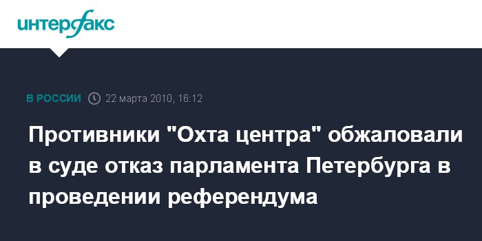 Москва. 22 марта. INTERFAX.RU – Инициативная группа по проведению референдума о строительстве "Охта центра" в Петербурге обжаловала в суде отказ Законодательного собрания города в проведении плебисцита.