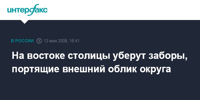Москва. 13 мая. INTERFAX.RU - В Восточном административном округе столицы приступают к масштабной программе по ликвидации заборов, сообщили "Интерфаксу" в пресс-службе префектуры ВАО. "В предварительном списке кандидатов на снос уже значатся порядка 80 объектов. В основном это ограждения промышленных предприятий, сделанные из железобетона и находящиеся в плохом состоянии", - сказал собеседник агентства.