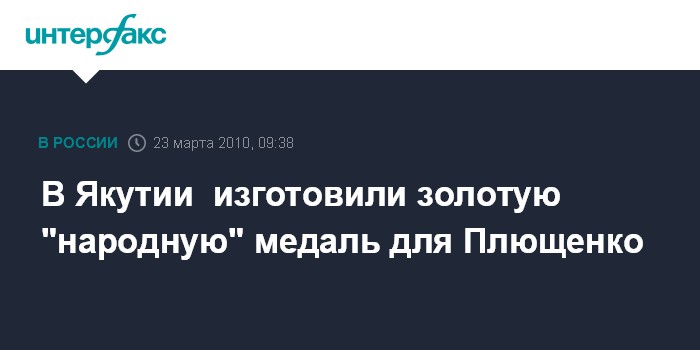 Москва. 23 марта. INTERFAX.RU - В Якутске одна из ювелирных компаний во вторник презентовала журналистам так называемую "народную" медаль для фигуриста Евгения Плющенко. Медаль отлита на ювелирном заводе компании в Якутске и будет готова после чистовой обработки в конце недели, передает корреспондент агентства "Интерфакс - Дальний Восток". "Народная" медаль, как и олимпийская медаль Ванкувера, весит 516 граммов, но не позолочена, как оригинал, а полностью отлита из золота 750 пробы.