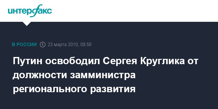 Как сообщает во вторник пресс-служба правительства РФ, Путин подписал распоряжение об освобождении Сергея Круглика от должности заместителя министра регионального развития России по его просьбе.
