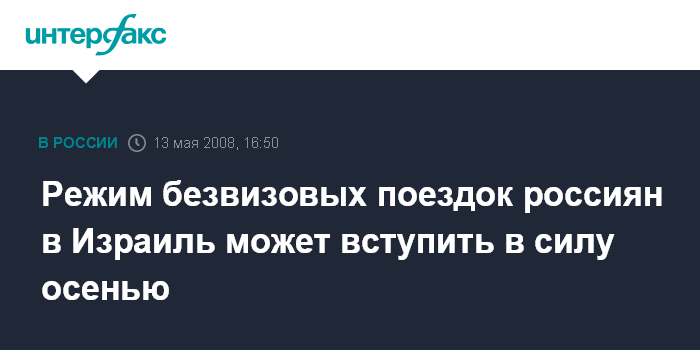 Азари отказалась назвать конкретную дату, когда будут приняты все документы, необходимые для вступления в силу режима о безвизовых поездках граждан РФ в Израиль, однако отметила, что "этот вопрос может быть решен и осенью". По ее словам, соответствующее соглашение должен ратифицировать Кнессет (израильский парламент), который в настоящее время находится на парламентских каникулах.