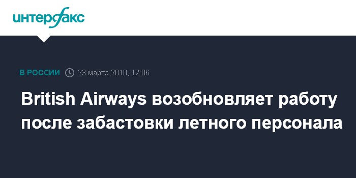 Москва. 23 марта. INTERFAX.RU - Британская авиакомпания British Airways возобновляет нормальный режим работы после завершения трехдневной забастовки летного персонала, сообщила во вторник британская телерадиокорпорация BBC. Несколько рейсов авиакомпании все же будут отменены во вторник, однако в течение ближайших четырех дней большинство служб начнут работать в нормальном режиме.