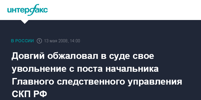 Москва. 13 мая. INTERFAX.RU - Бывший начальник Главного следственного управления (ГСУ) Следственного комитета при прокуратуре (СКП) РФ Дмитрий Довгий подал в Басманный суд Москвы жалобу на свое увольнение. "В Басманный суд Москвы 12 мая поступило исковое заявление Дмитрия Довгия о восстановлении на работе", - сообщила "Интерфаксу" во вторник руководитель пресс-службы Мосгорсуда Анна Усачева. По ее словам, дата рассмотрения данного иска в суде пока не назначена.
