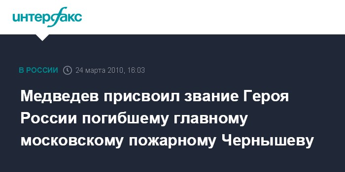 Москва. 24 марта. INTERFAX.RU - Президент России Дмитрий Медведев подписал Указ о присвоении звания "Героя России" начальнику Службы пожаротушения Москвы Евгению Чернышеву посмертно, сообщила в среду пресс-секретарь главы государства Наталья Тимакова.