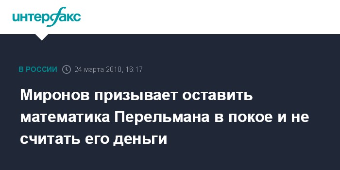 Миронов призывает оставить математика Перельмана в покое и не считать его деньги