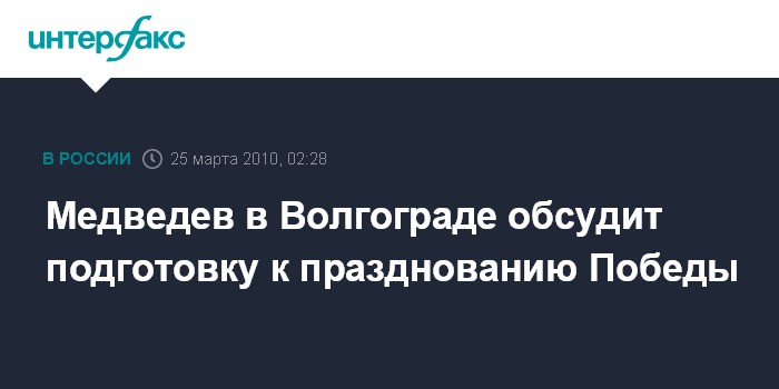 Москва. 25 марта. ИНТЕРФАКС - Президент РФ Дмитрий Медведев отправляется в Волгоград, где проведет заседание Российского организационного комитета "Победа".
