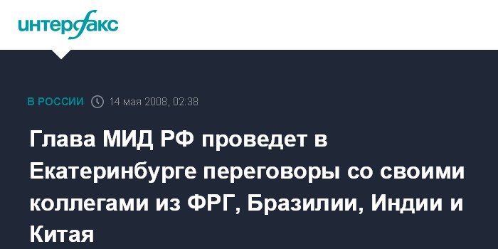 Глава МИД РФ проведет в Екатеринбурге переговоры со своими коллегами из ФРГ, Бразилии, Индии и Китая