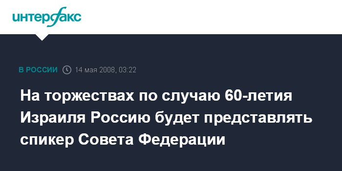 Москва. 14 мая. ИНТЕРФАКС - Спикер Совета Федерации Сергей Миронов будет представлять Россию на праздновании шестидесятилетия образования государства Израиль.