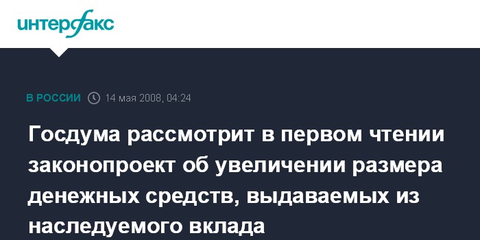 Госдума рассмотрит в первом чтении законопроект об увеличении размера денежных средств, выдаваемых из наследуемого вклада