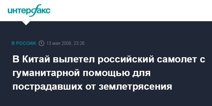 Москва. 13 мая. ИНТЕРФАКС - Самолет МЧС России с грузом гуманитарной помощи во вторник вечером вылетел в Китай, где произошло сильное землетрясение.