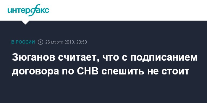 Москва. 26 марта. INTERFAX.RU - Лидер КПРФ Геннадий Зюганов призывает не спешить с подписанием нового российско-американского договора по СНВ и его ратификацией парламентом обеих стран.