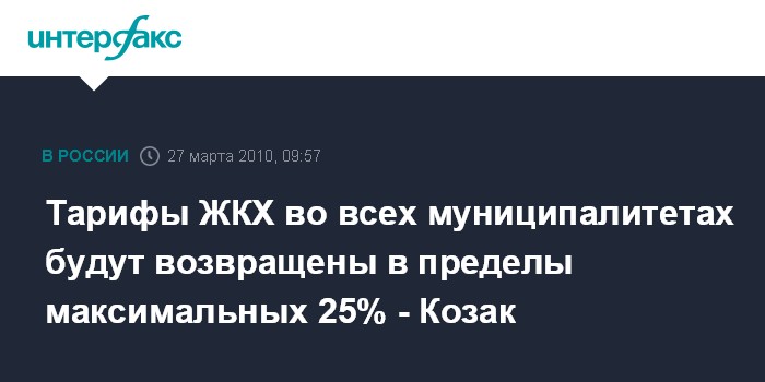 Сочи. 27 марта. INTERFAX.RU - Тарифы на ЖКХ в скором времени во всех муниципальных образованиях , в которых был выявлен рост платежей, будут возвращены на прежний уровень, проводится работа для исключения возможности манипулирования тарифами в рамках закона, сообщил вице-премьер Дмитрий Козак. Он доложил Д.Медведеву, что после поручения президента проведены селекторные совещания со всеми руководителями региона вне зависимости от того, были там повышены тарифы или нет.